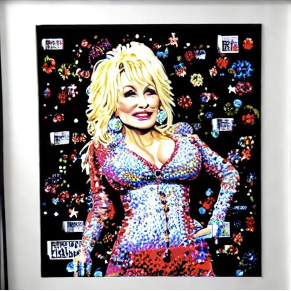 This exceptional transformative piece of art is a unique portion of the fantastical artwork Artists Meet Artists. As envisaged and then passionately created, Artists Meet Artists is a technically masterful, thought provoking, intellectually stimulating, emotion evoking, historically and culturally significant, didactic, immense, unequivocally transformative one-of-a-kind work of art, comprising 25,600 such individually qualifying works of art from the pioneering state-of-the-art Artists Meet Artists creation. Each of the matchless 25,600 pieces of generative art, collectively Artists Meet Artists, exclusively envisions one of 36 among the greatest musical artists of our lives having an opportunity to meet and be painted in the style of one of 69 of the greatest visual artists of the past six centuries, each distinctive square an artistic fantasy Artists Meet Artists pairing, most requiring time travel. This piece imagines the Musical Artist Dolly Parton meets and is painted by the Visual Artist Damien Hirst.