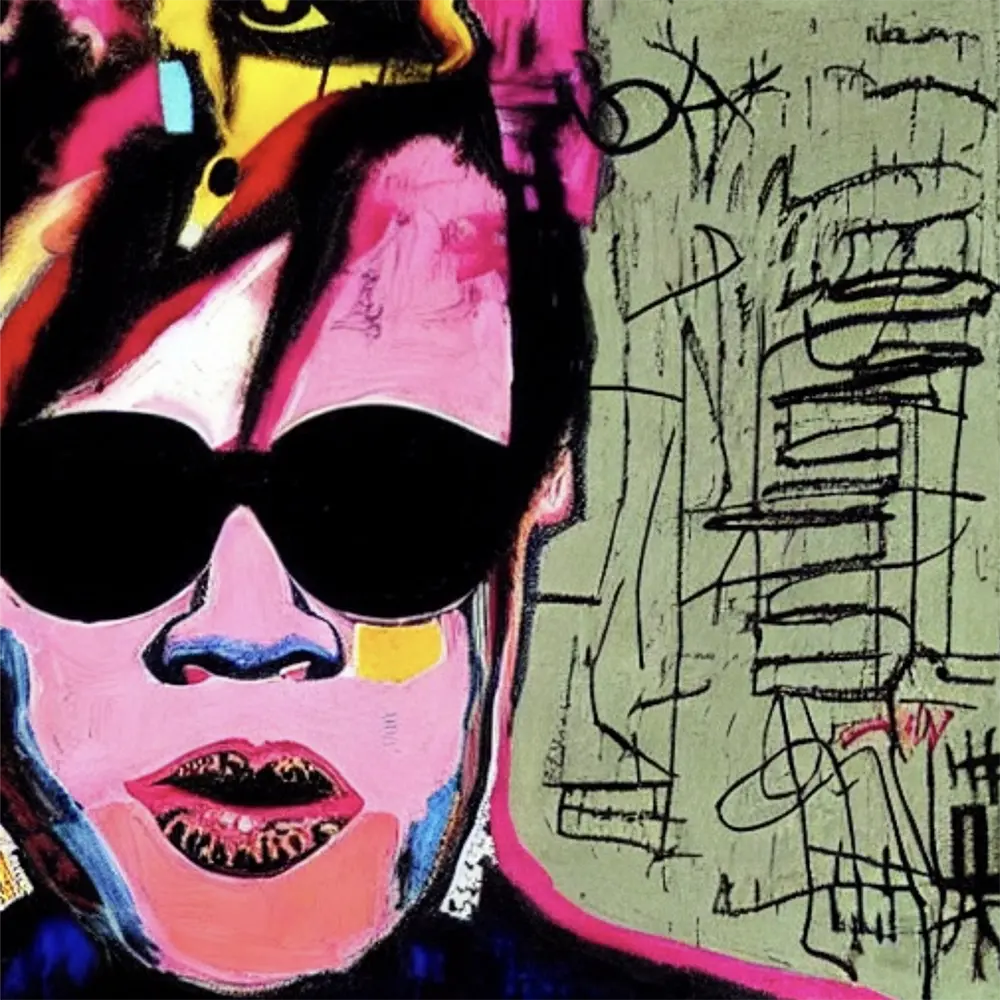 This exceptional transformative piece of art is a unique portion of the fantastical artwork Artists Meet Artists. As envisaged and then passionately created, Artists Meet Artists is a technically masterful, thought provoking, intellectually stimulating, emotion evoking, historically and culturally significant, didactic, immense, unequivocally transformative one-of-a-kind work of art, comprising 25,600 such individually qualifying works of art from the pioneering state-of-the-art Artists Meet Artists creation. Each of the matchless 25,600 pieces of generative art, collectively Artists Meet Artists, exclusively envisions one of 36 among the greatest musical artists of our lives having an opportunity to meet and be painted in the style of one of 69 of the greatest visual artists of the past six centuries, each distinctive square an artistic fantasy Artists Meet Artists pairing, most requiring time travel. This piece imagines the Musical Artist Elton John meets and is painted by the Visual Artist Jean-Michel Basquiat.