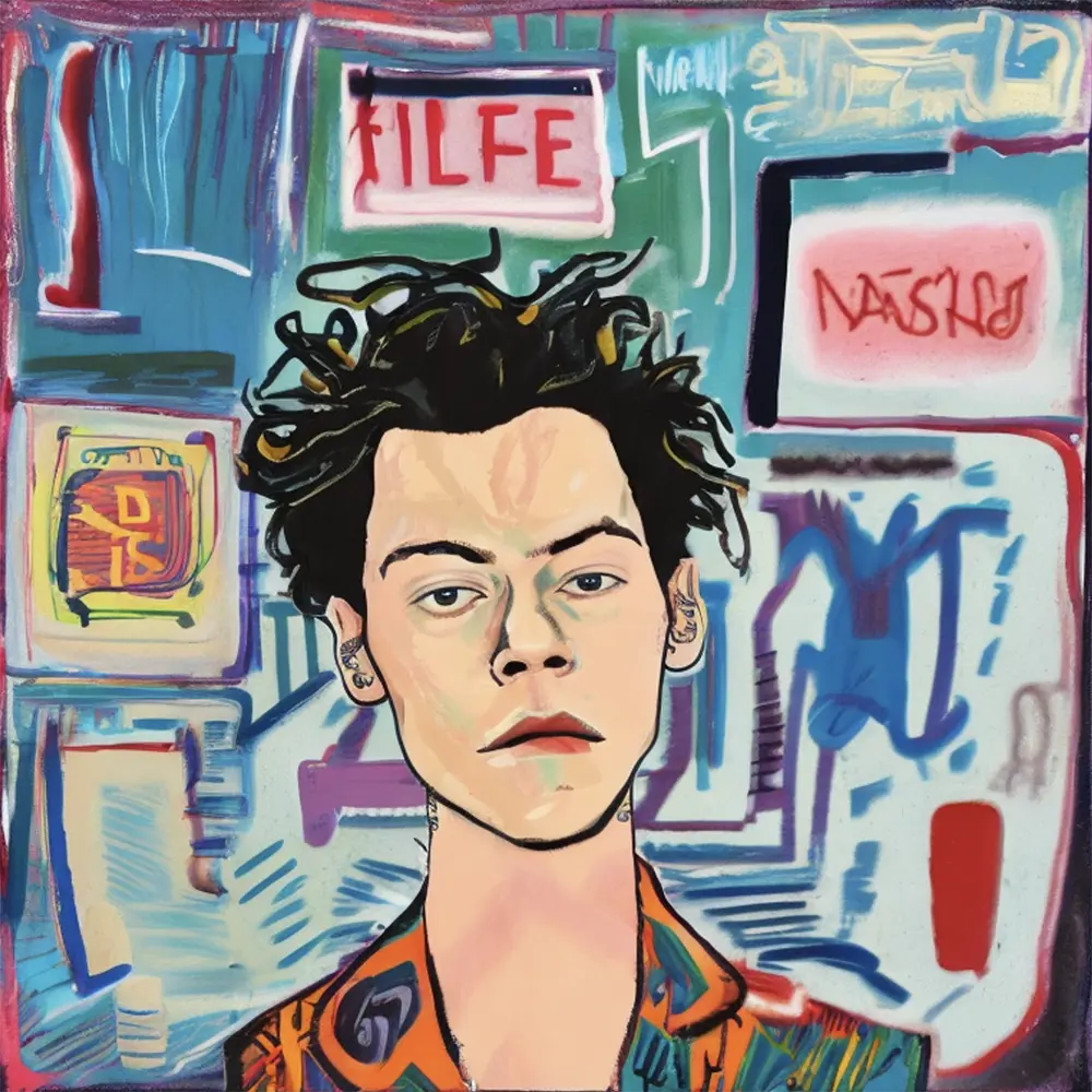 Musical Artist Harry Styles in the style of Visual Artist Jean-Michel Basquiat, from the Artists Meet Artists Collection