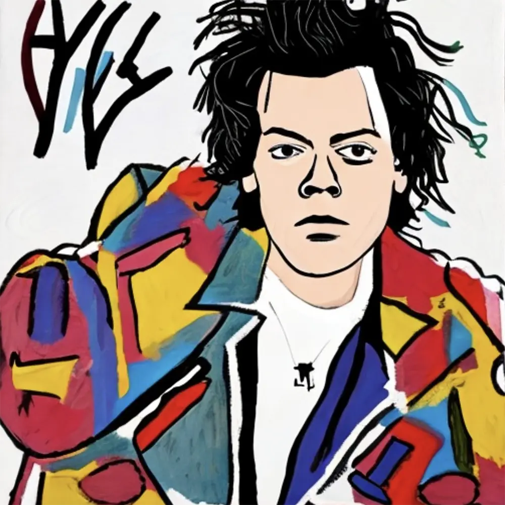 Musical Artist Harry Styles in the style of Visual Artist Jean-Michel Basquiat, from the Artists Meet Artists Collection