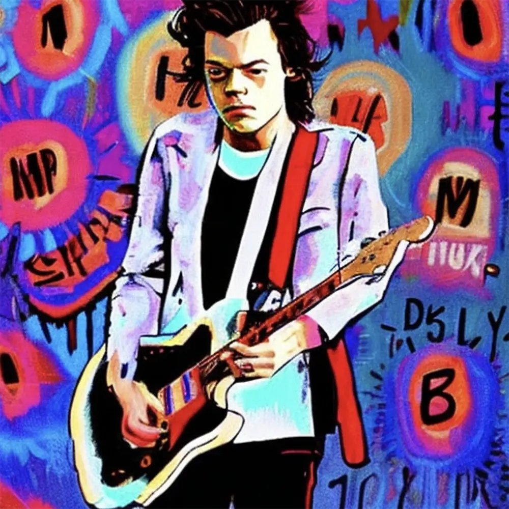 Musical Artist Harry Styles in the style of Visual Artist Jean-Michel Basquiat, from the Artists Meet Artists Collection