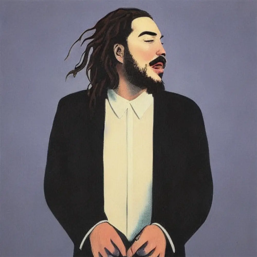 Musical Artist Post Malone in the style of Visual Artist Rene Magritte, from the Artists Meet Artists Collection
