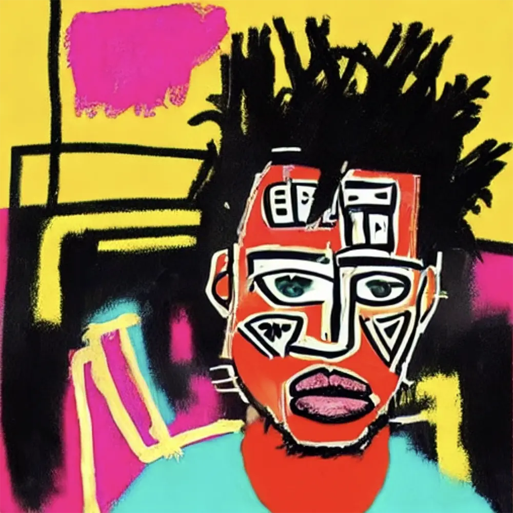 This exceptional transformative piece of art is a unique portion of the fantastical artwork Artists Meet Artists. As envisaged and then passionately created, Artists Meet Artists is a technically masterful, thought provoking, intellectually stimulating, emotion evoking, historically and culturally significant, didactic, immense, unequivocally transformative one-of-a-kind work of art, comprising 25,600 such individually qualifying works of art from the pioneering state-of-the-art Artists Meet Artists creation. Each of the matchless 25,600 pieces of generative art, collectively Artists Meet Artists, exclusively envisions one of 36 among the greatest musical artists of our lives having an opportunity to meet and be painted in the style of one of 69 of the greatest visual artists of the past six centuries, each distinctive square an artistic fantasy Artists Meet Artists pairing, most requiring time travel. This piece imagines the Musical Artist Weeknd meets and is painted by the Visual Artist Jean-Michel Basquiat.